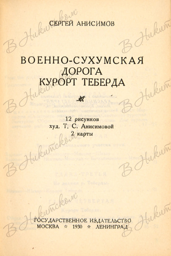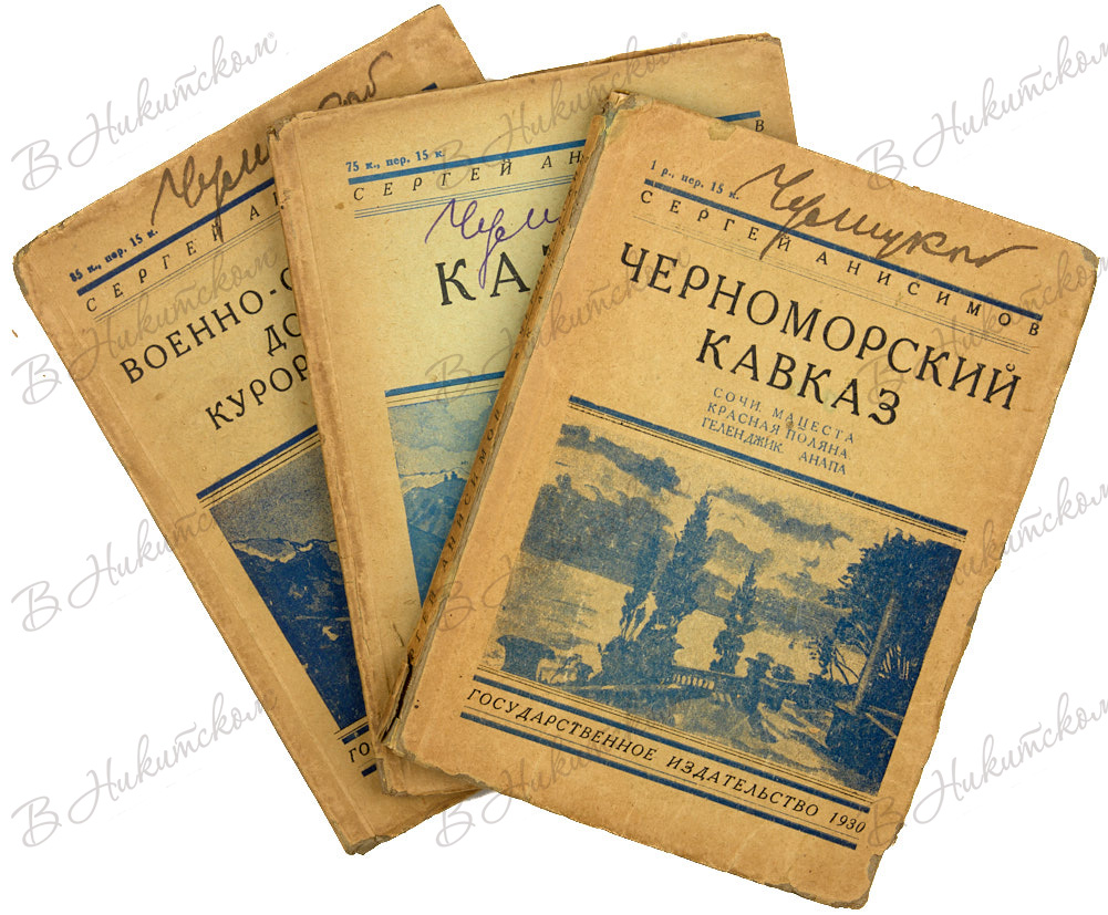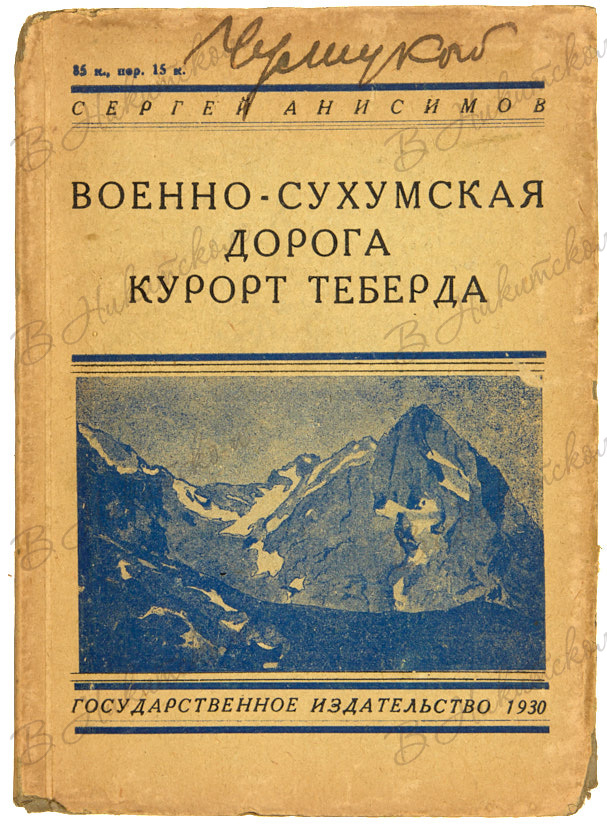 1. Анисимов, С. Военно-Сухумская дорога. Курорт Теберда. 12 рис. худ. Т.С. Анисимовой. 2 карты. М.; Л.: Государственное издательство, 1930. 135, [1] с., 2 л. карт., ил. 16,8 х 12 см. В картонажном издательском иллюстрированном переплете. Следы выцветания переплета, потертости. Владельческие надписи фиолетовыми чернилами на лицевой переплетной крышке и титульном листе. В хорошем состоянии.