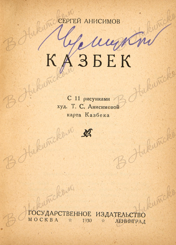 2. Анисимов, С. Казбек. М.; Л.: Государственное издательство, 1930. С 11 рисунками худ. Т.С. Анисимовой, карта Казбека. М.; Л.: Государственное издательство, 1930. 88 с., 1 л. карт, ил. 16,8 х 12 см. В картонажном издательском иллюстрированном переплете. Следы выцветания переплета, потертости. Владельческие надписи фиолетовыми чернилами на лицевой переплетной крышке и титульном листе. В хорошем состоянии.