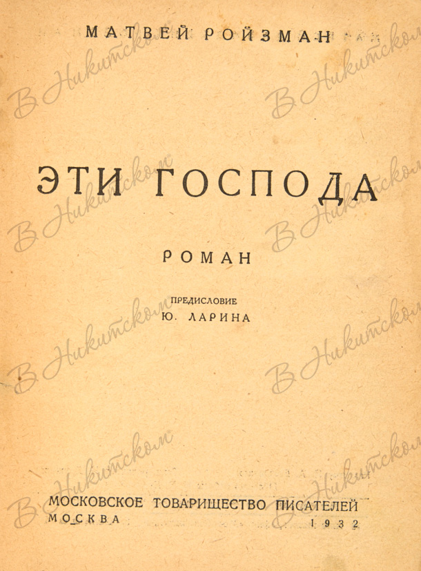 Ройзман, М.Д. Эти господа. Роман / предисл. Ю. Ларина, оформ. обл. Н.В. Кузмина. М.: Московское т-во писателей, 1932.