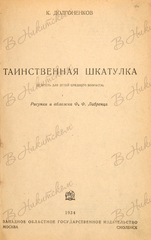 Долгоненков, К. Таинственная шкатулка. (Повесть для детей среднего возраста) / рисунки и обложка Ф.Ф. Лабренца. М.; Смоленск: Западное областное государственное издательство, 1934.