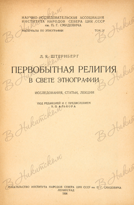 Штернберг, Л.Я. Первобытная религия в свете этнографии. Исследования, статьи, лекции / под ред. и с предисл. Я.П. Алькора. Л: Издательство Ин-та народов Севера ЦИК СССР им. П.Г. Смидовича, 1936.