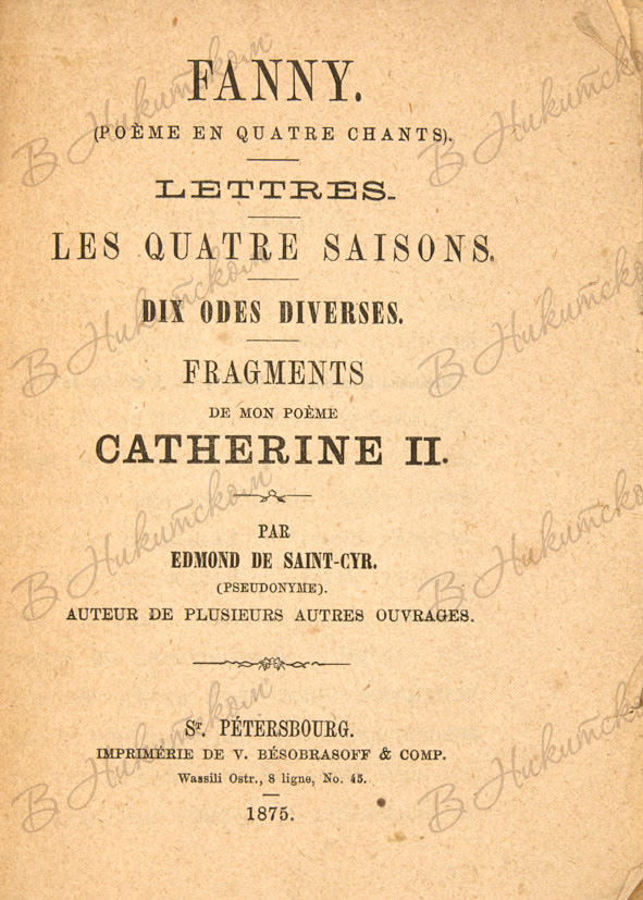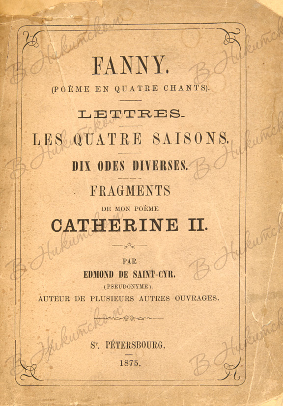 [Издание на франц. языке. Фанни (Стихотворение в четырех песнях). Письма. Фрагменты моего стихотворения «Екатерина II».]. Fanny (Poeme en quatre chants). Lettres. Fragments de mon poeme Catherine II. СПб.: Тип. В. Бессарабова и К°, 1875.