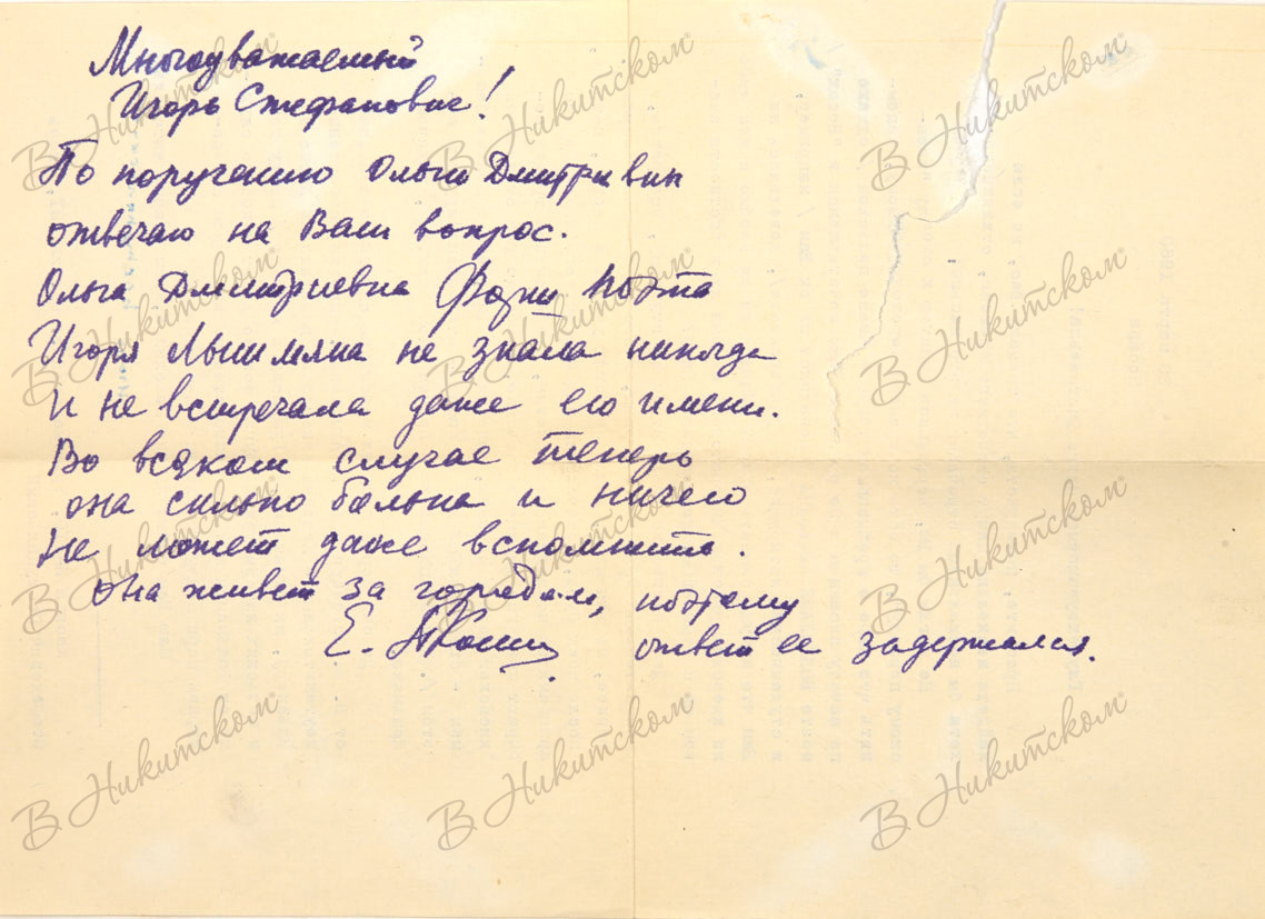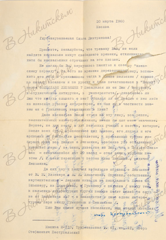 29 х 20,5 см. В письме Игорь Поступальский спрашивает Ольгу Форш о польском поэте Б. Лешьмяне. На обороте письма, по просьбе писательницы написан ответ, по-видимому, кем-то из родственников или соседей. Письмо вложено в конверт, в котором было отправлено обратно И. Поступальскому. Надрыв письма.