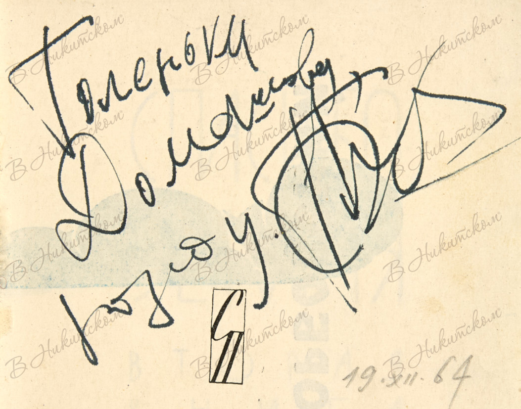1. Горбовский, Г. [Автограф]. Спасибо, земля. Вторая книга стихов. М.; Л.: «Советский писатель», 1964. 114, [2] с. 16,3 х 11 см. В издательской обложке и суперобложке. Потертости суперобложки. Обложка и блок в очень хорошем состоянии. На авантитуле дарственная надпись: «Толеньке / Долматову, / [нрзб.] (подпись)».