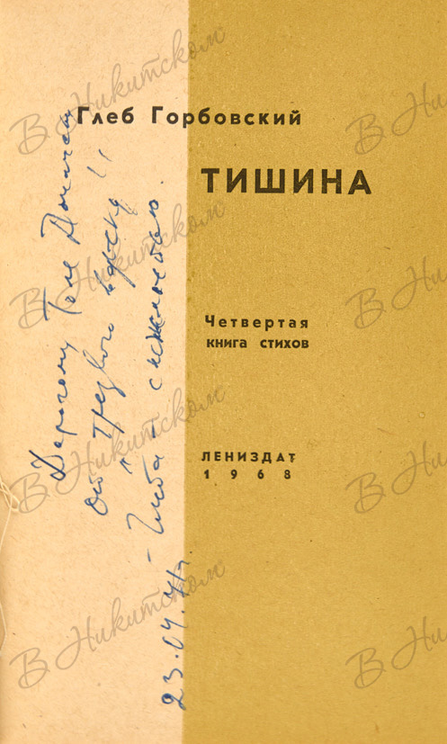 2. Горбовский, Г. [Автограф]. Тишина. Четвёртая книга стихов. Л.: Лениздат, 1968. 110, [1] с. 16,5 х 10,8 см. В иллюстрированной издательской обложке. В отличном состоянии. На титульном листе автограф автора: «Дорогому Толе Докучаеву от "трезвого [нрзб]" / - Глеба - с нежностью. / 23.04.71 г.».