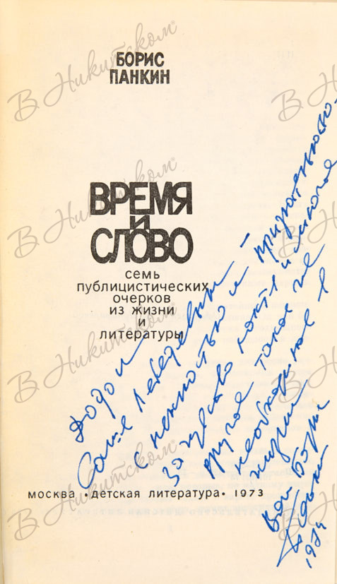 Панкин, Б. [Борис Панкин]. Время и слово. Семь публицистических очерков из жизни и литературы. М.: «Детская литература», 1973.