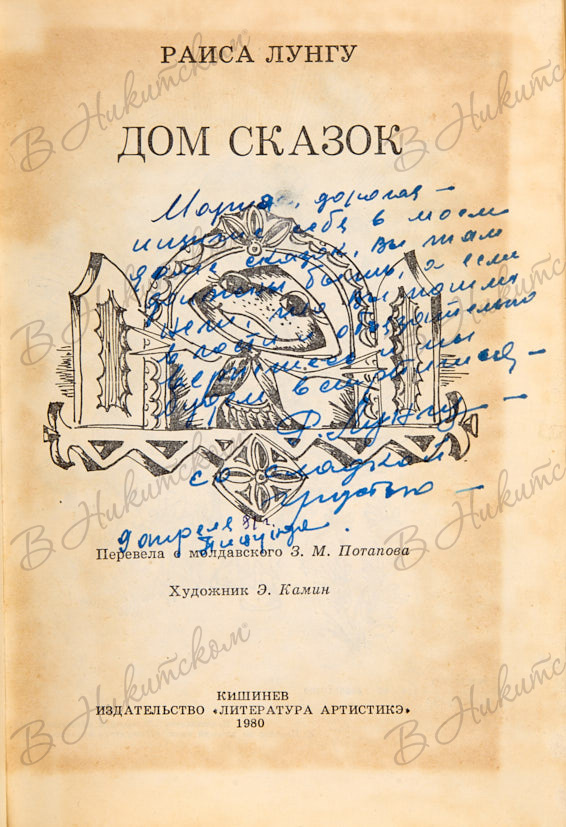 Лунгу, Р. [Автограф]. Дом сказок / перевела с молдавского З.М. Потапова; худ. Э. Камин. Кишинёв: Издательство «Литература артистикэ», 1980.