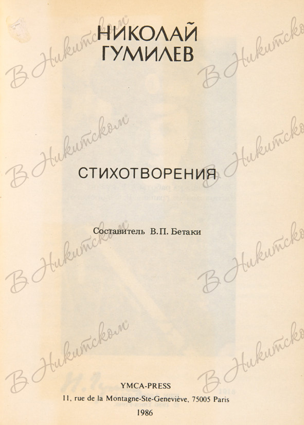 Николай Гумилёв. Стихотворения / составитель В.П. Бетаки. Париж: YMCA-PRESS, 1986.