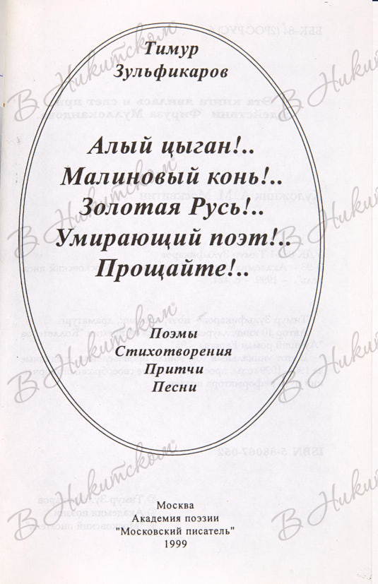 Зульфикаров, Т. [Автограф]. Алый цыган! Малиновый конь! Золотая Русь! Умирающий поэт! Прощайте! Поэмы. Стихотворения. Притчи. Песни. М.: Академия поэзия «Московский писатель», 1999.