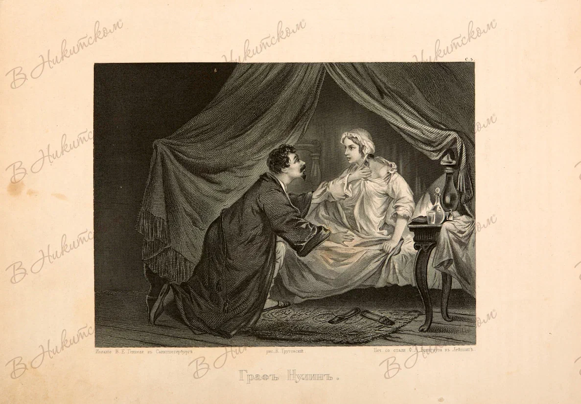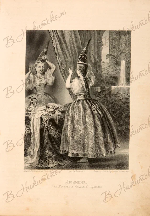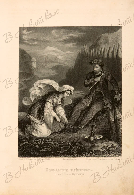 Лот из шести гравюр из альбома "Северное сияние. Русский художественный альбом" В.Г. Генкеля в Санкт-Петербурге. Иллюстрации к произведениям А.С. Пушкина "Граф Нулин", "Кавказский пленник", "Руслан и Людмила", "Юорис Годунов". 1862-1865. Гравюра резцом и пунктиром на стали. 19,3*26,3 см.