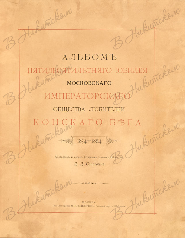 Сонцов, Д.Д. Альбом пятидесятилетнего юбилея Московского Императорского Общества любителей конского бега. М.: Типо-лит. М.И. Нейбюргера, [1884].
