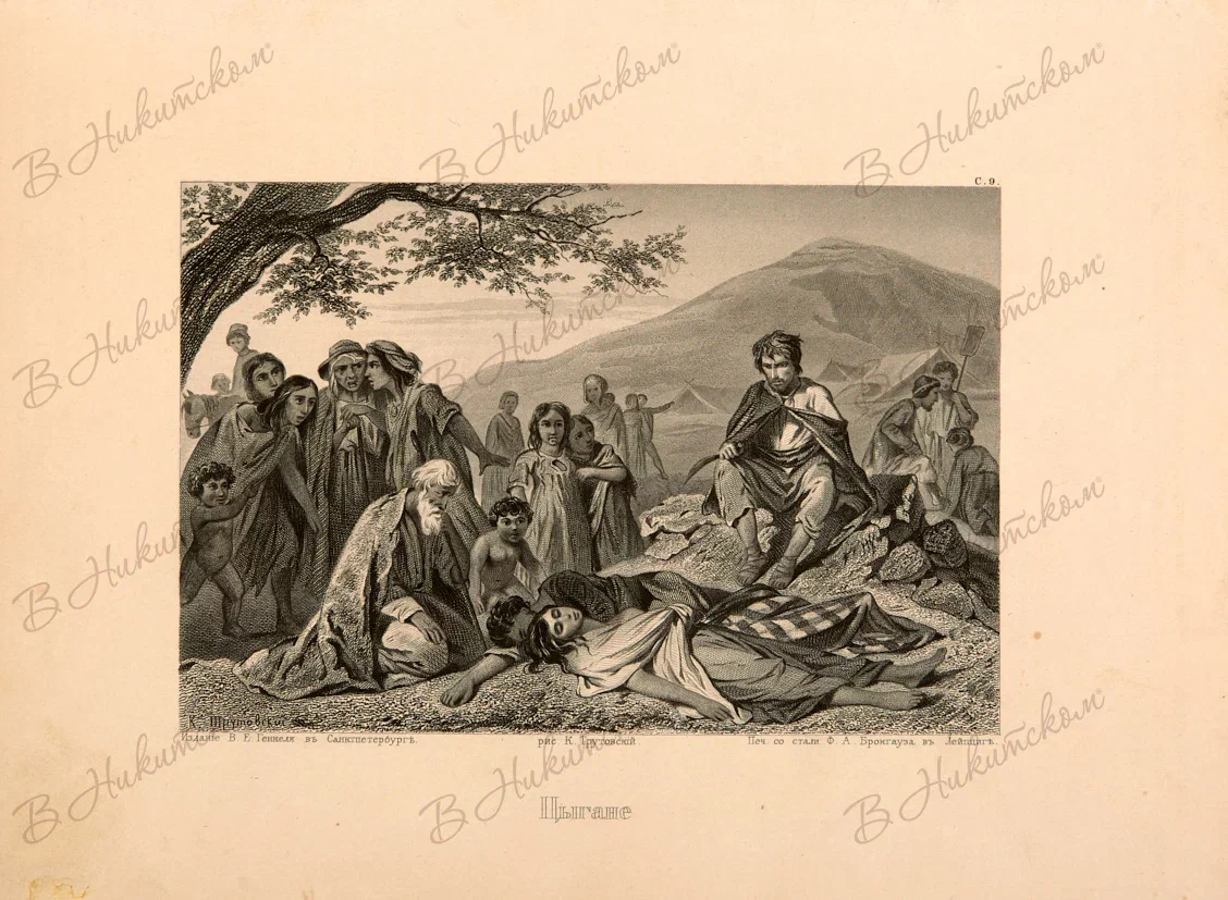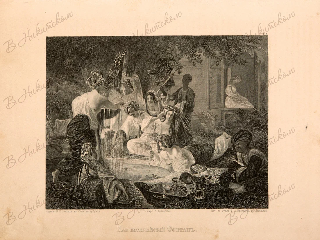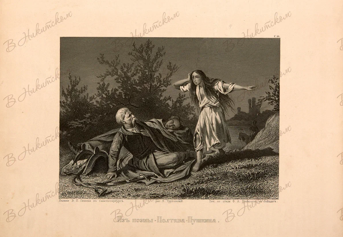 Лот из шести гравюр из альбома "Северное сияние. Русский художественный альбом" В.Г. Генкеля в Санкт-Петербурге. Иллюстрации к произведениям А.С. Пушкина. "Бахчисарайский фонтан", "Жених", "Цыгане", "Полтава", "Евгений Онегин". 1862-1865. Гравюра резцом и пунктиром на стали. 19,3*26,3 см.