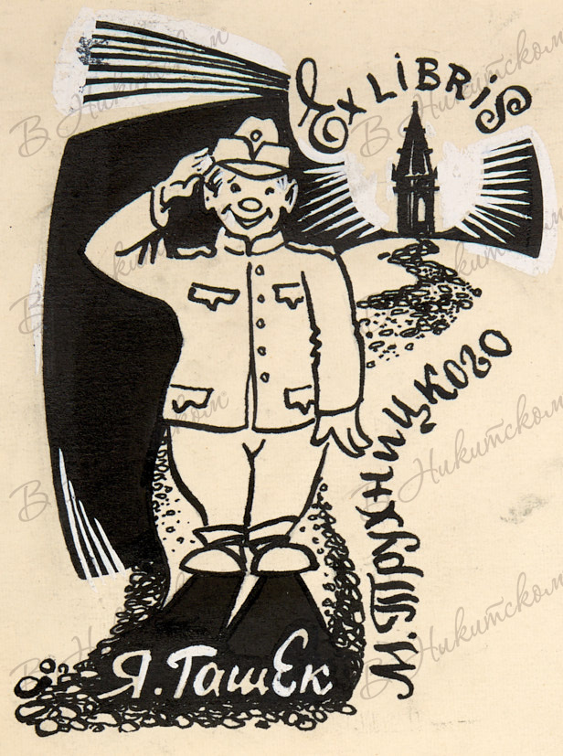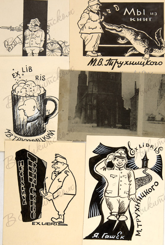 Лот из 7 эскизов книжных знаков М. Трухницкого на тему романа Я. Гашека «Похождения бравого солдата Швейка». 1970-е гг. Бумага, тушь, 8*10 см.