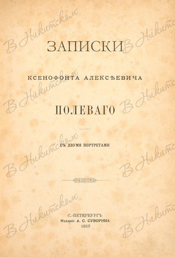 Записки Ксенофонта Алексеевича Полевого. С двумя портретами. СПб.: Издание А.С. Суворина, 1888.
