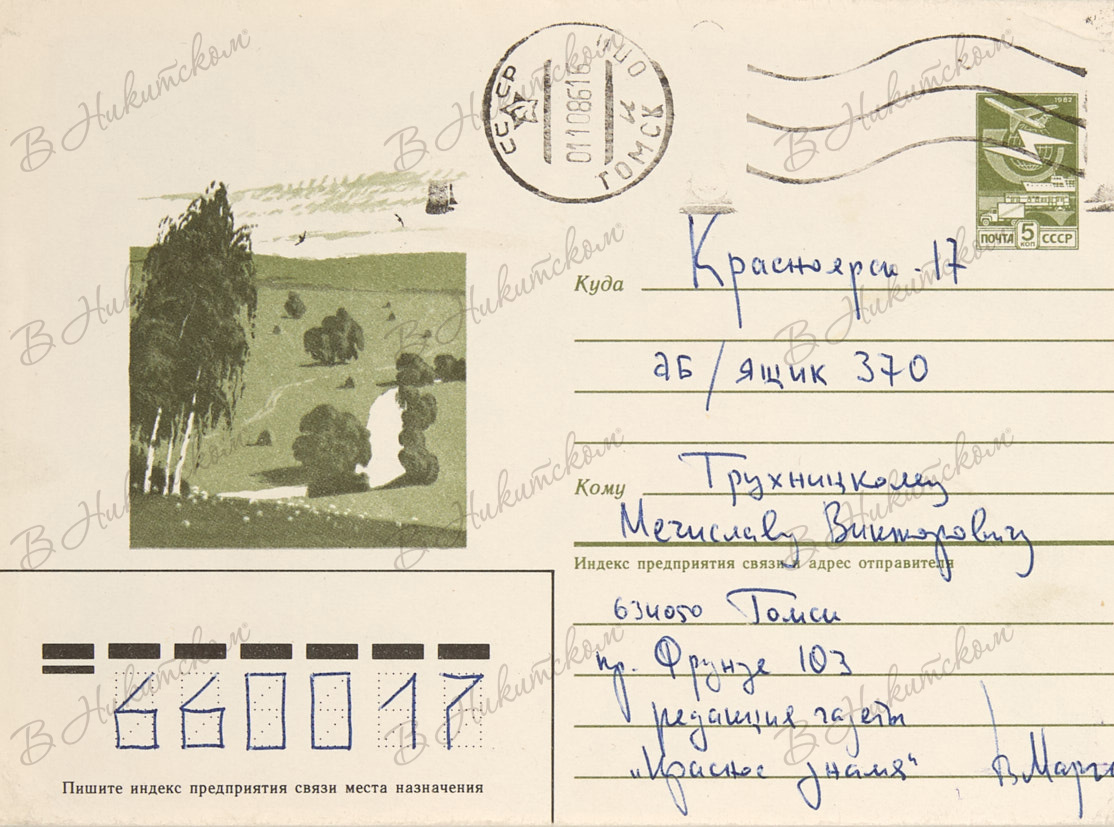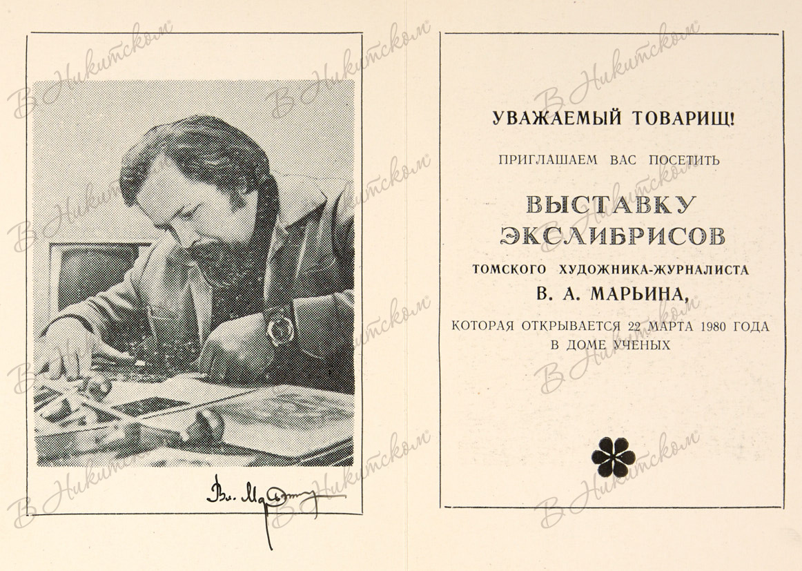 Бумага, офорт, ксилография, 14*9 см. С приложением рукописного письма, приглашения и фото художника.