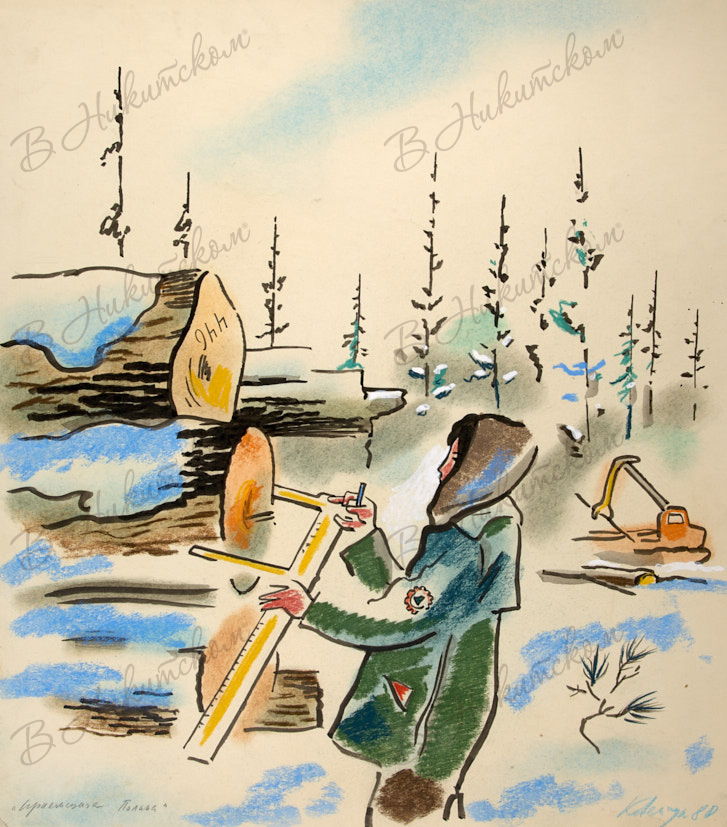 Приемщица Полина. 1980 г. Бумага, смешанная техника, 48×43 см.