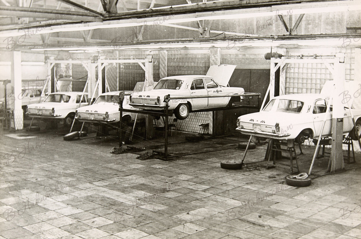 Из истории московского такси. В ремонтной мастерской таксопарка. 1970-е гг. Фотография, 20*29,5 см.