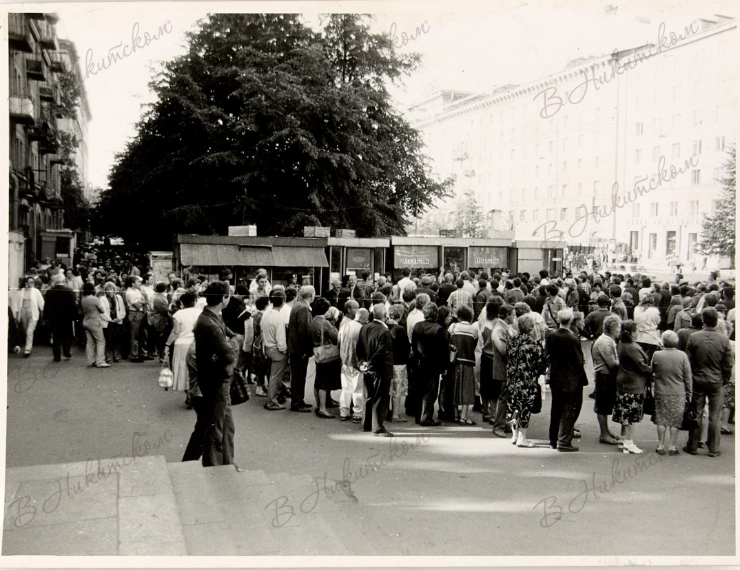 Очередь в табачный киоск в Ленинграде. 1990-е гг. Фотография, 18*23,8 см.