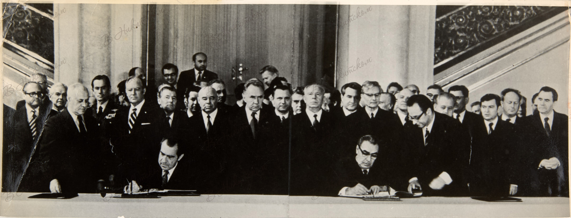 Л. И. Брежнев и Ричард Никсон. Подписание договора об ограничении систем противоракетной обороны. 1972 г. 11,5*30,5 см.