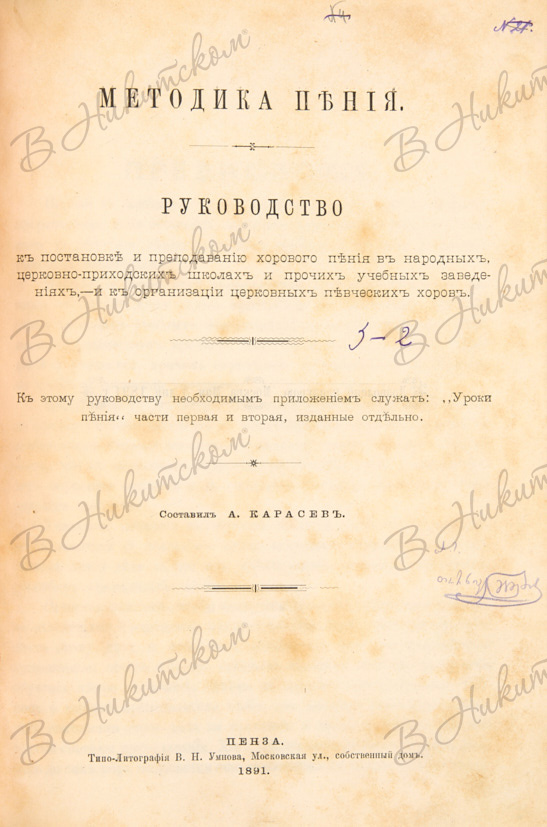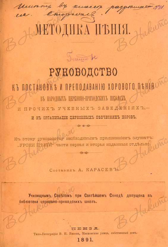 Карасёв, А. Методика пения. Руководство к постановке и преподаванию хорового пения в народных церковно-приходских школах и прочих учебных заведениях, и к организации церковных певческих хоров. Пенза: Типо-Литография В.Н. Умнова, 1891.