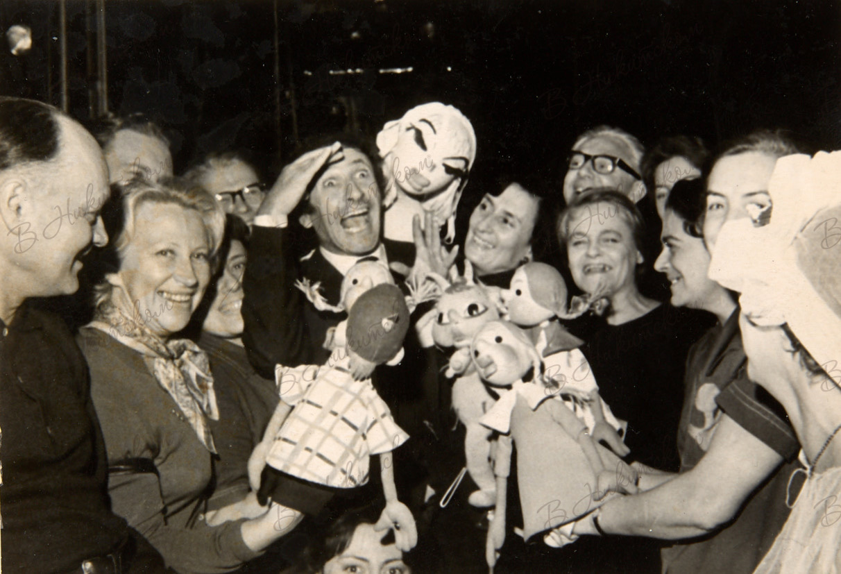 Французский актер Марсель Марсо с артистами театра С. Образцова. 1960-е гг. Фотография, 10,5*15,3 см.