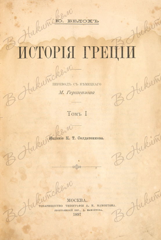 Белох, Ю. История Греции / перевод с нем. М. Гершензона. В 2 т. Т. 1. М.: Издание К.Т. Солдатенкова; т-во тип. А.И. Мамонтова, 1897.