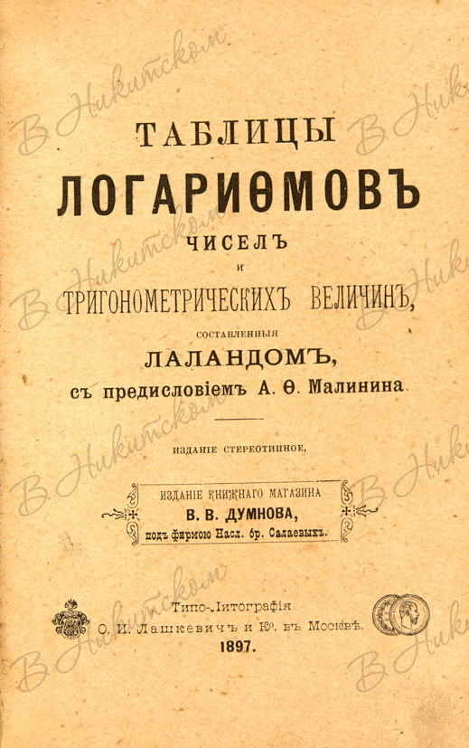 Таблицы логарифмов чисел и тригонометрических величин, составленные Лаландом, с предисловием А.Ф. Малинина. М.: Издание книжного магазина В.В. Думнова; типо-литография О.И. Лашкевич, 1897.
