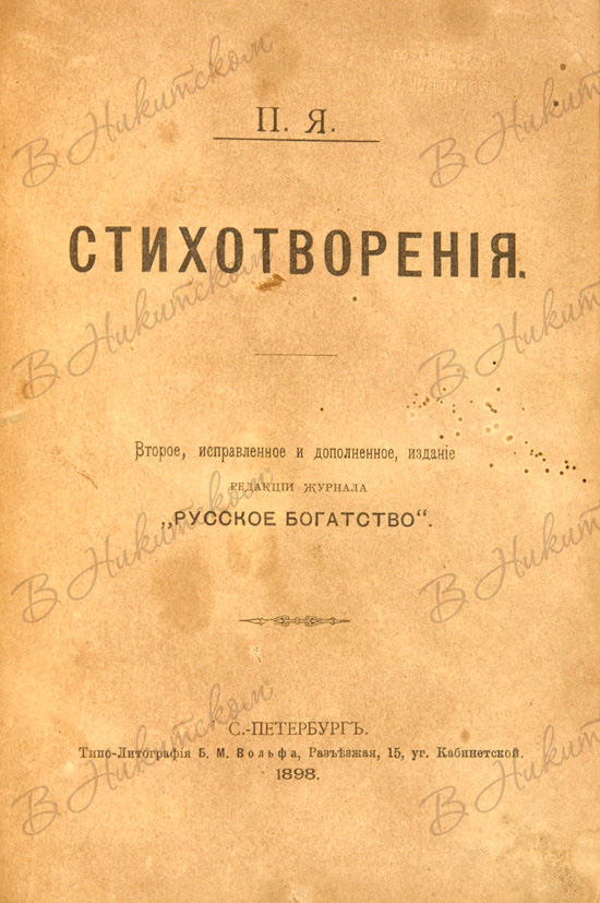 [Якубович, П.Я.] П.Я. Стихотворения. 2-е, исправленное и дополненное издание редакции журнала «Русское богатство», 1898. СПб.: Типо-Литография Б.М. Вольфа, 1898.