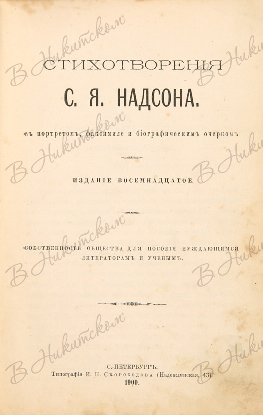 Стихотворения С.Я. Надсона. С портретом, факсимиле и биографическим очерком. 18-е изд. СПб.: Типографии И.Н. Скороходова, 1900.