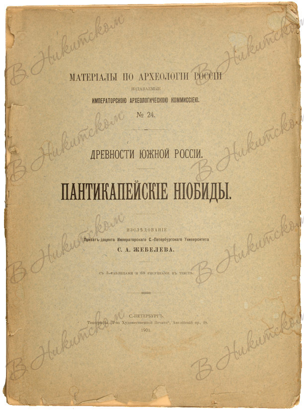 Жебелев, С.А. Древности южной России. Пантикапейские Ниобиды. Материалы по археологии России, издаваемые Императорскою Археологическою комиссиею. № 24. СПб.: Тип. «Т-ва Художественной Печати», 1901.