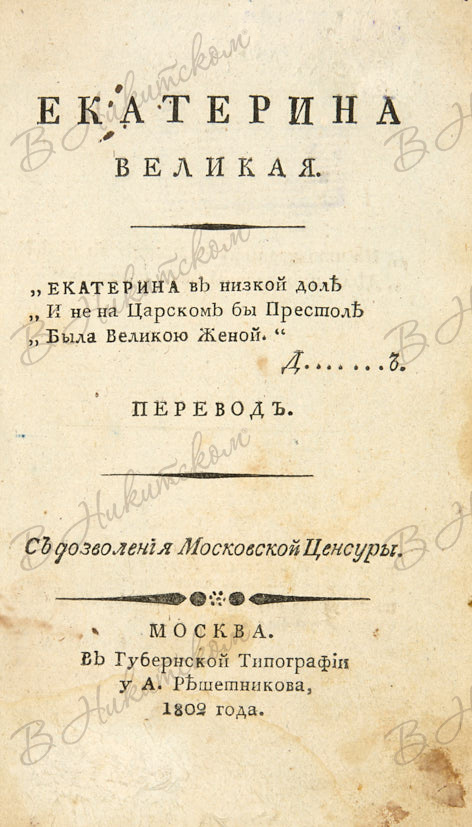 Ланжюине, Ж. де. Екатерина Великая / перевод [с фр. М.Д. Костогорова]. М.: В Губернской тип. у А. Решетникова, 1802.