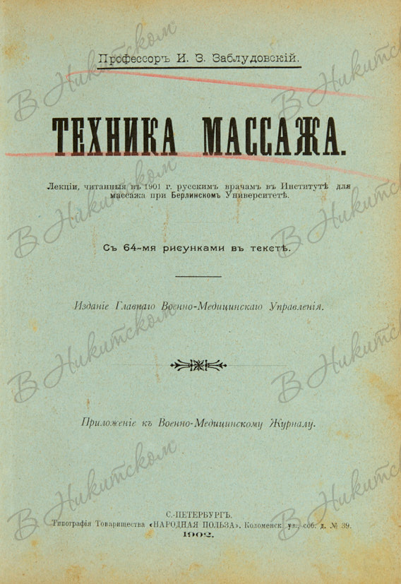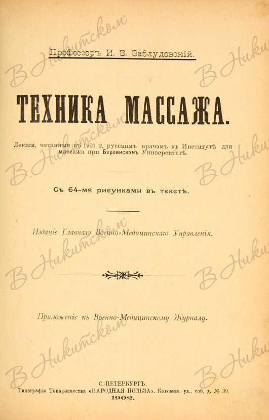 Заблудовский, И.В. Техника массажа. Лекции, читанные в 1901 г. русским врачам в Институте для массажа при Берлинском университете. СПб.: Изд. Главного военно-медицинского управления, 1902.