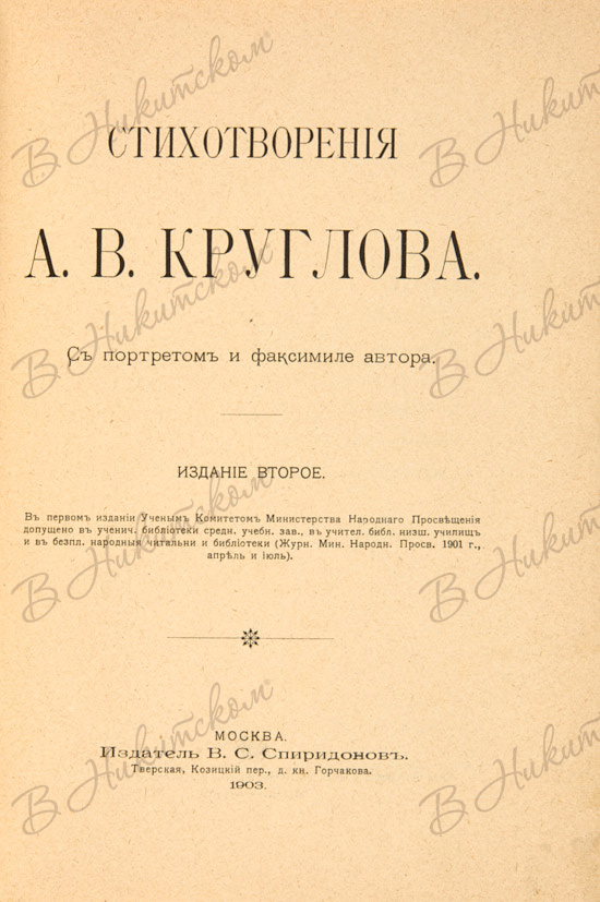 Стихотворения А.В. Круглова. С портретом и факсимиле автора. Издание 2-е. М.: Издание В.С. Спиридонова, 1903.