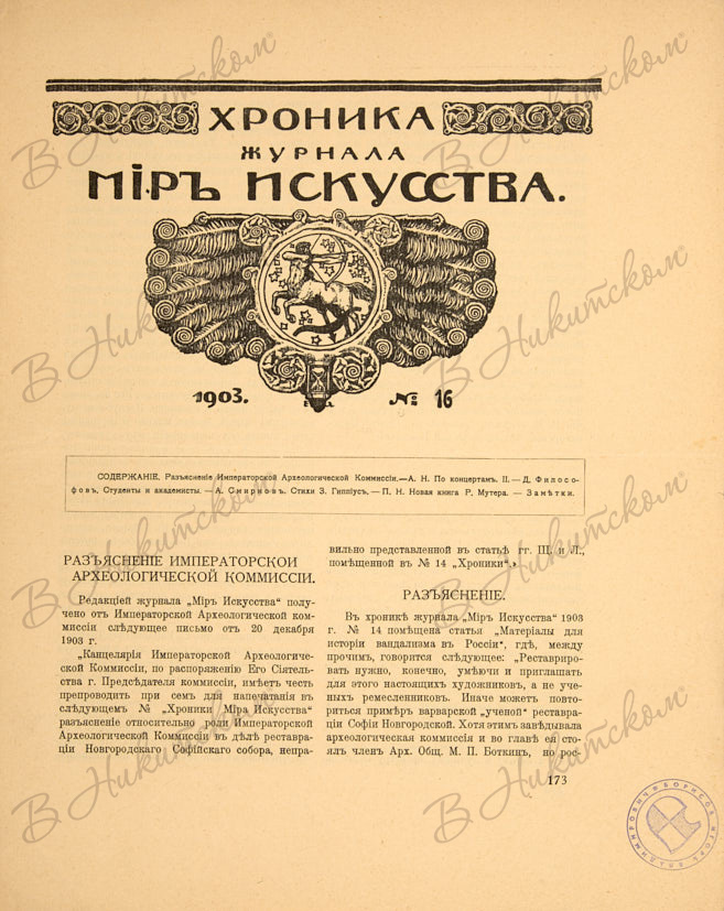 Хроника журнала Мир искусства за 1903 г. / ред. С.П. Дягилев и А. Бенуа. №№ 1-16. СПб.: Коммерческая скоропечатня, 1903.