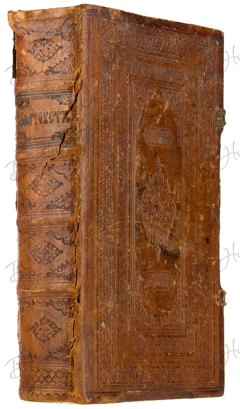 [8], 336 л. 33,5 х 22 см. Печать в две краски. Гравированные заставки, буквицы, рамка на полях. В цельнокожаном переплете эпохи с блинтовым тиснением. Без застежек. Небольшой надрыв верхнего края корешка, нет свободных листов форзацев, утрата нижнего поля последнего листа (текст не задет), незначительные пятна, следы от перелистывания. На заднем форзаце дореволюционный штамп «Книжная и иконная торговля С.Т. Большакова. С.-Петербург» и владельческая надпись: «Сия книга поступила из г. Каргополя 1990 г. Малофеев Ю.А.».