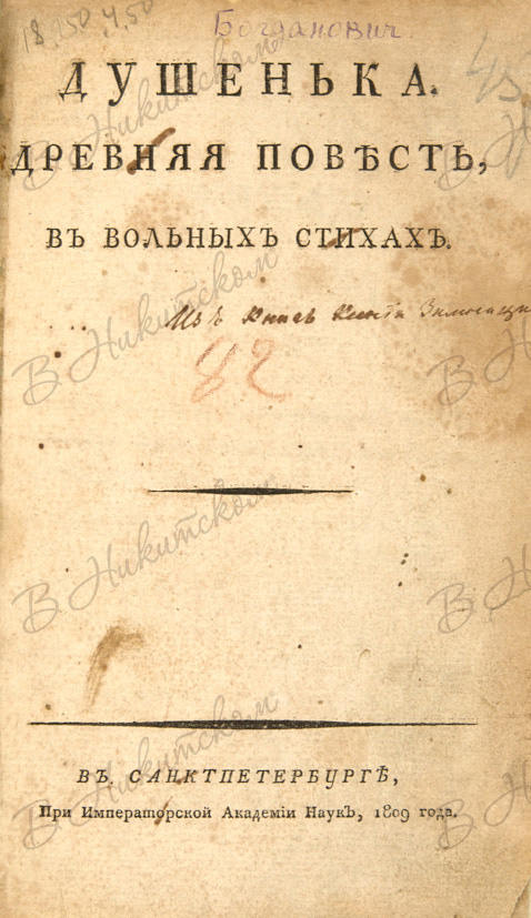 Богданович, И.Ф. Душенька. Древняя повесть, в вольных стихах. СПб.: При Имп. Акад. наук, 1809.
