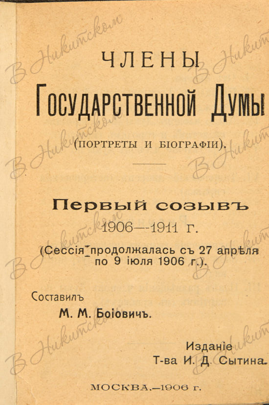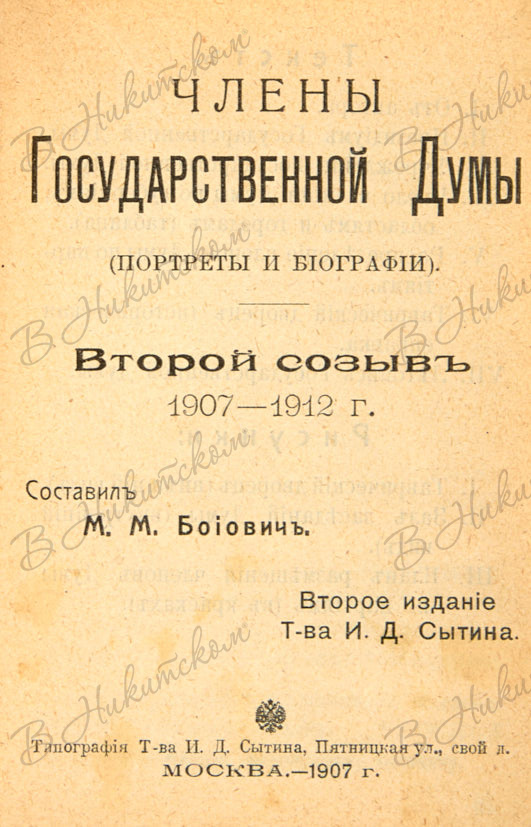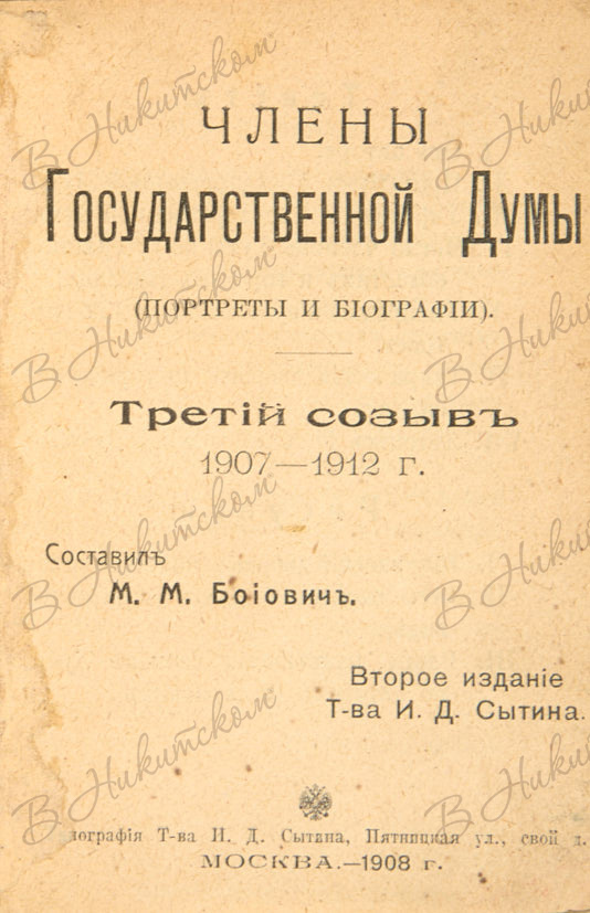 Боиович, М.М. Члены Государственной думы. (Портреты и биографии). [Три выпуска]. М.: Тип. Т-ва И.Д. Сытина, 1906-1908.