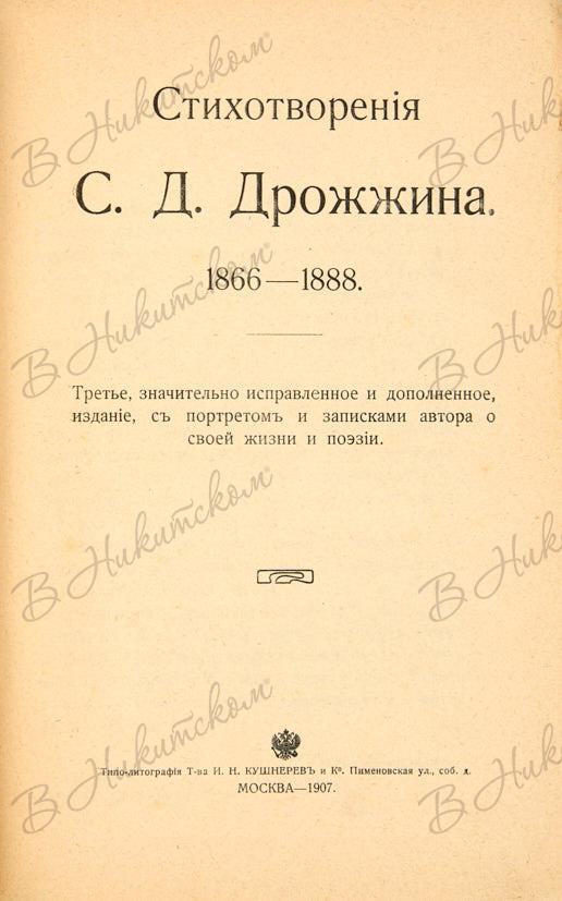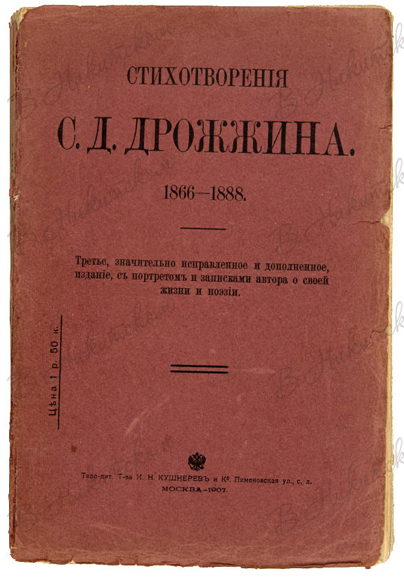 Стихотворения С.Д. Дрожжина. 1866 – 1888. 3-е издание. М.: Типо-литография Т-ва И.Н. Кушнерёв, 1907.