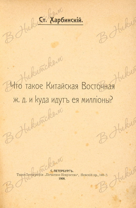 Что такое Китайская-Восточная ж.д. и куда идут миллионы. СПб.: Типо-Литография «Печатное Искусство», 1908.