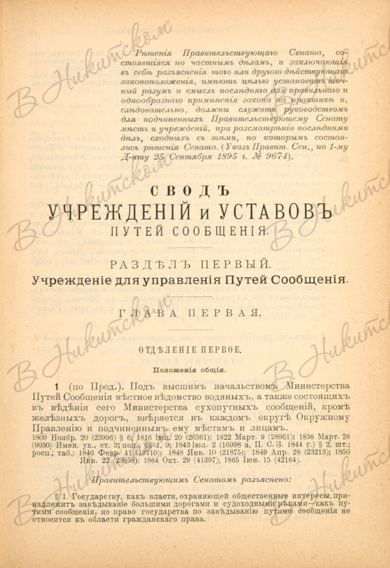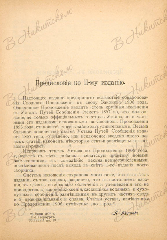Якушев, А.А. Устав путей сообщения (т. XII, ч. 1 Свода зак.) с разъяснениями Правительствующего сената, касающимися водяных и шоссейных сообщений. 2-е изд. СПб.: Тип. Усмановой, 1908.