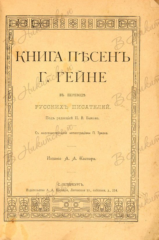 Книга песен Г. Гейне / В переводе русских писателей. С многочисленными иллюстрациями П. Тумана. Ред. Н.А. Каспари. Вып. 1. СПб.: Издание А.А. Каспари, [1909].
