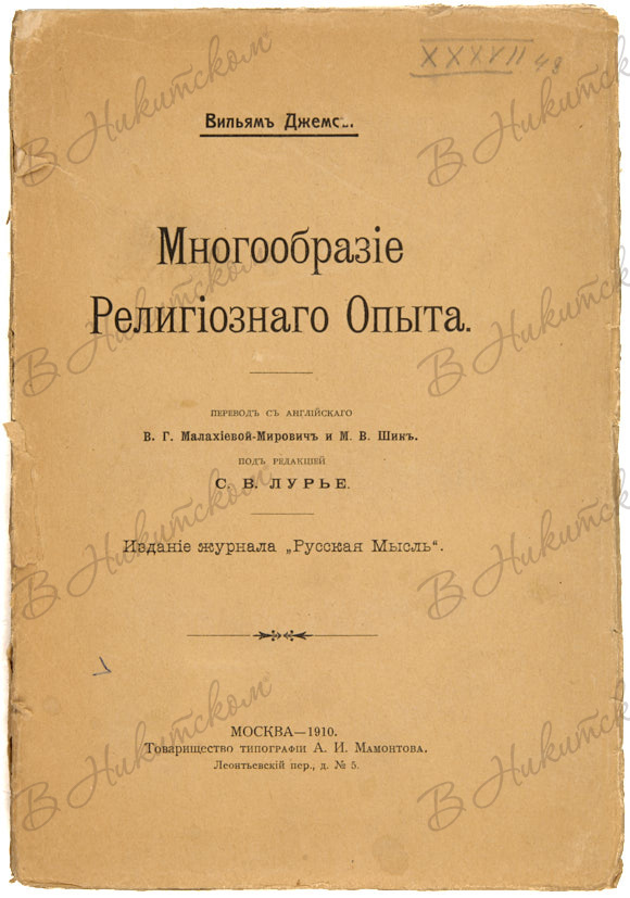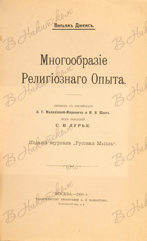 Джемс, В. Многообразие религиозного опыта / пер. с англ. В.Г. Малахиевой-Мирович и М.В. Шик; под ред. С.В. Лурье. М.: Издание журнала «Русская мысль», 1910.