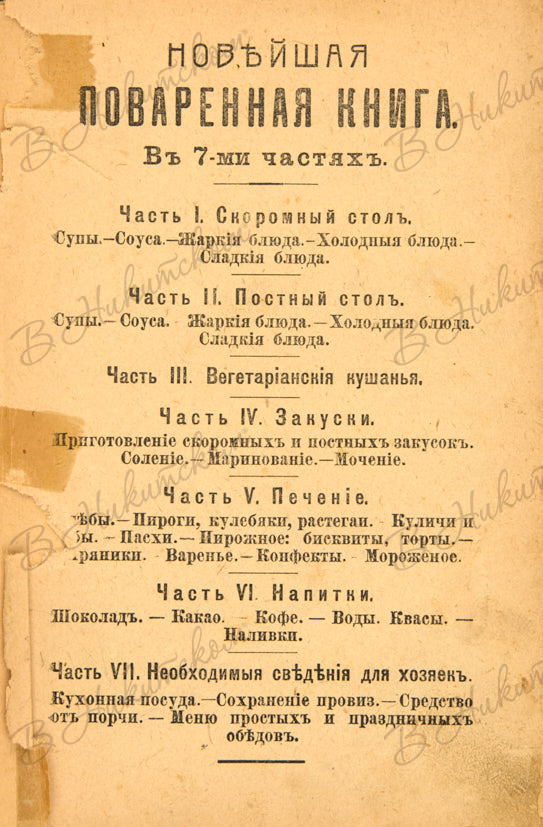 [Псевдо-Молоховец]. Полный подарок молодым хозяйкам. Новейшая поваренная книга в 7 частях. Самое полное руководство к приготовлению разнообразных изысканных кушаний доступных для всех... / составила опытная хозяйка Е. Молоховцева. [М., 1910-е].