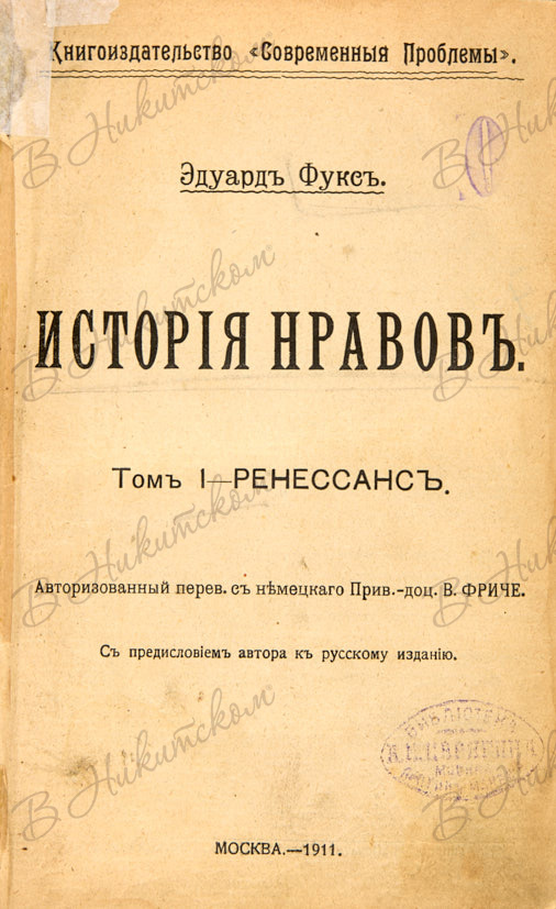 Фукс, Э. История нравов. В 3 т. Т. 1: Ренессанс. М.: Книгоиздательство «Современные проблемы», 1911.