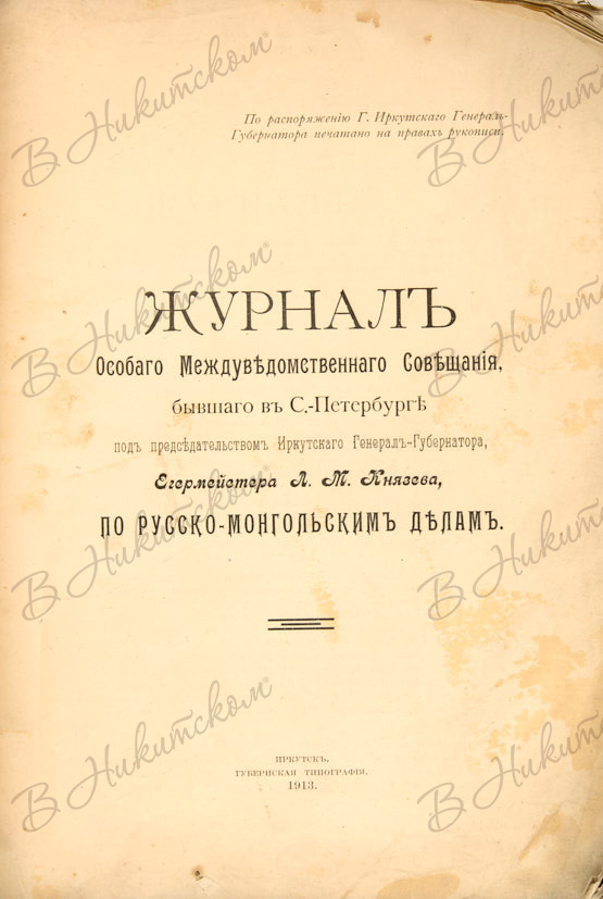 Журнал Особого Междуведомственного Совещания, бывшего в С.-Петербурге под представительством Иркутского Генерал-Губернатора, Егермейстера Л.М. Князева, по русско-монгольским делам. Иркутск: Губернская типография, 1913.