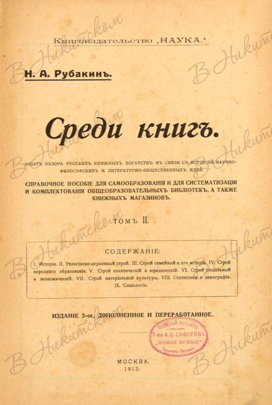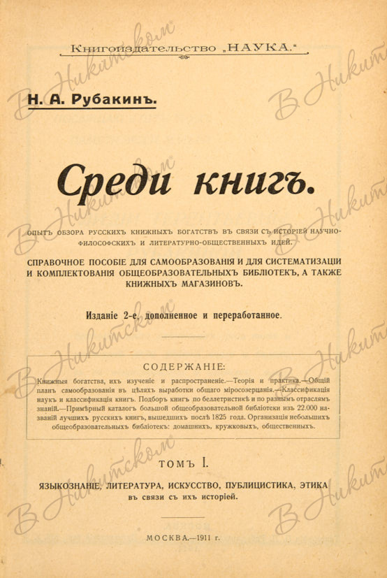 Рубакин, Н.А. Среди книг. Опыт обзора русских книжных богатств в связи с историей научно-философских и литературно-общественных идей. 2-е изд. [В 3 т.] Т. 1, 2. М.: Наука, 1911-1913.