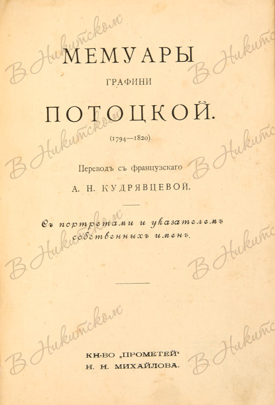 Мемуары графини Потоцкой (1794-1820) / пер. с франц. А.Н. Кудрявцевой. СПб.: Кн-во «Прометей» Н.Н. Михайлова, [1915].