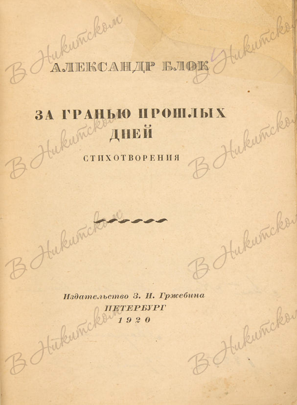 Блок, А. За гранью прошлых дней. Стихотворения. Пб.: Издательство З.И. Гржебина, 1920.