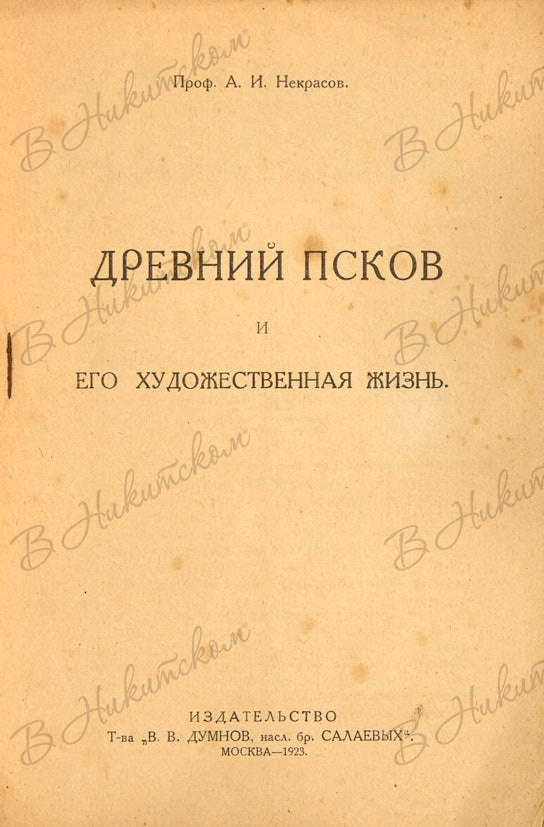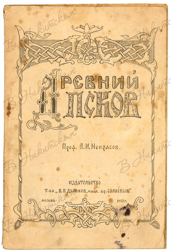 Проф. Некрасов, А.И. Древний Псков. М.: Издательство Т-ва В.В. Думнов, насл. бр. Салаевых, 1923.