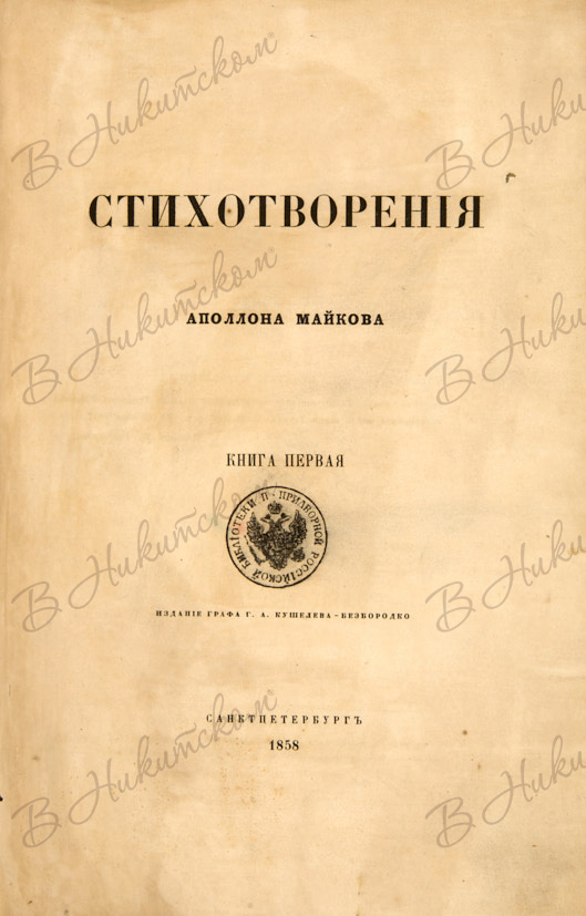 Майков, А.Н. Стихотворения Аполлона Майкова. [В 2 кн.] Кн. 1. СПб.: Изд. графа Г.А. Кушелев-Безбородко, 1858.